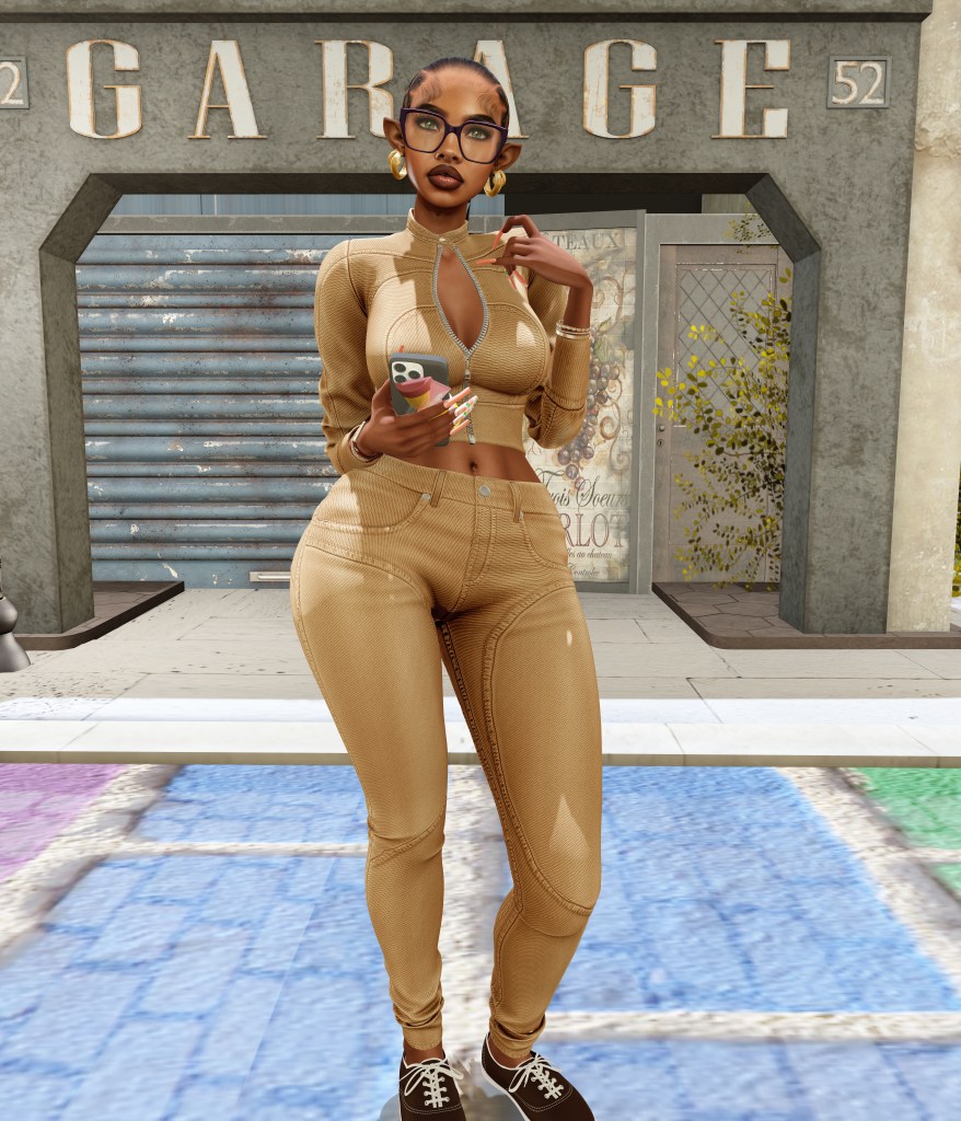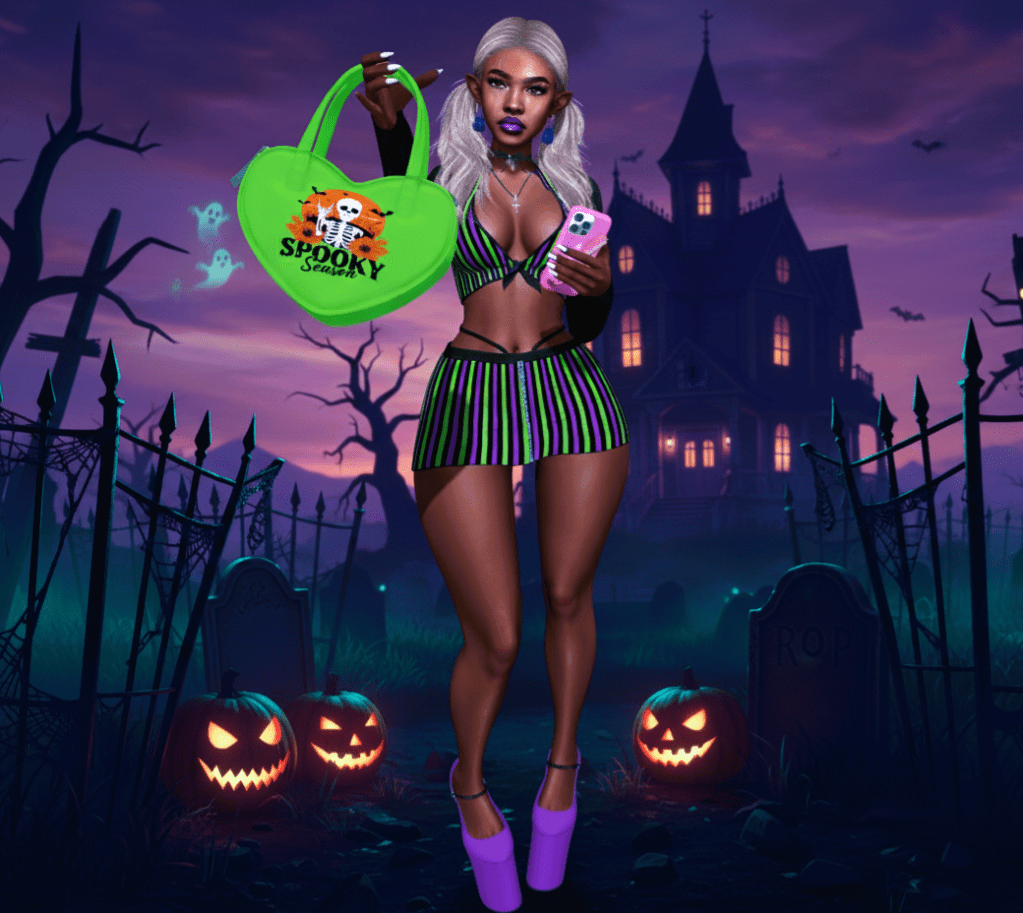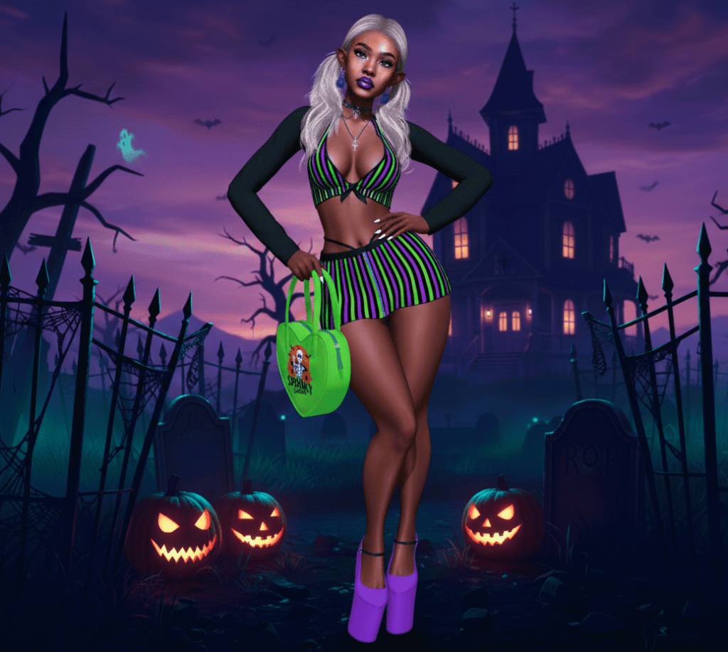 October is that month for me — the vibes, the fashion, the excuse to be spooky and stylish. I pulled up to this haunted mansion lookin’ like candy and chaos rolled into one. Between the purple sky, glowing pumpkins, and the little ghosts floating by, this was too perfect not to turn into a photo moment.